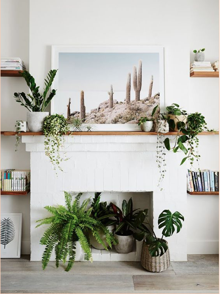 This fireplace is decorated with plants at every level and of different shapes, colours and textures to create a bold look. The hearth not used for fire anymore, can be used as a plant nook.